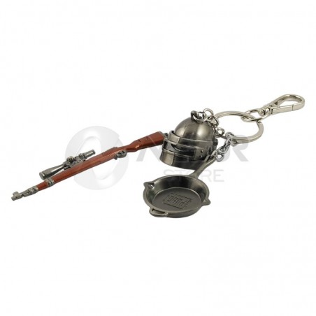 Llaveros PUBG 3 en 1. Diseño de casco, sartén y arma en un solo llavero. Hechos de metal con acabados de alta calidad en altos y bajos relieves.